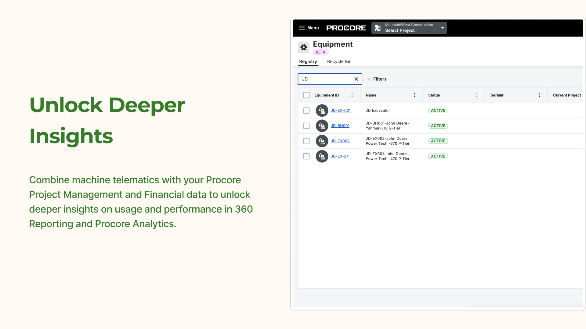 - Combine machine telematics with your Procore Project Management and Financial data to unlock deeper insights on usage and performance in 360 Reporting and Procore Analytics.