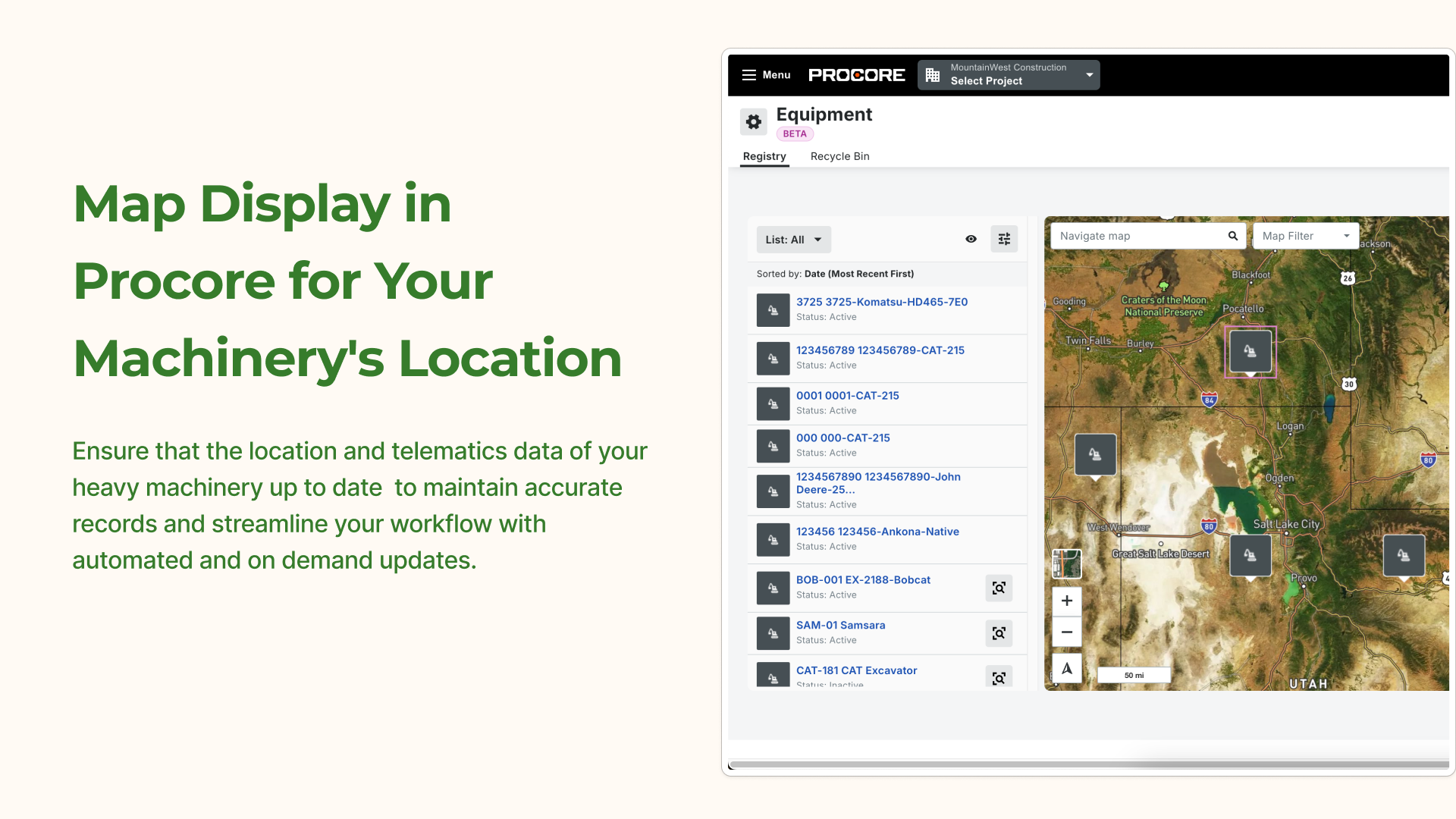 - View real-time locations of your machinery displayed directly on a map within Procore, enhancing visibility and project management efficiency.