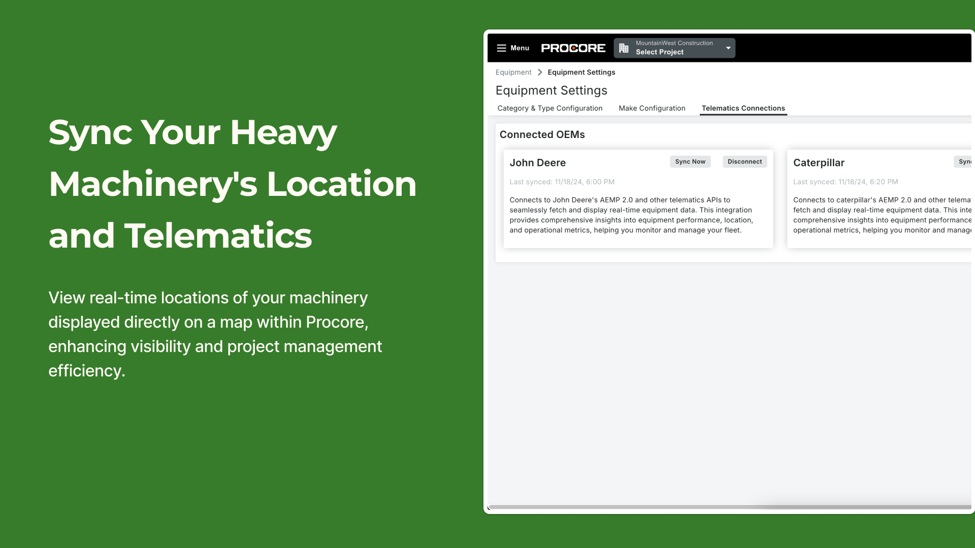 Using the integration, contractors can leverage John Deere machine telematics to track their equipment and assets in Procre. Once the setup is completed with John Deere's marketplace, the integration allows for seamless synchronization of equipment and telematics data to Procore. This enables the real-time monitoring of equipment, including location tracking, operational status, and maintenance alerts, ensuring that all equipment data is aligned with other critical project data in Procore.