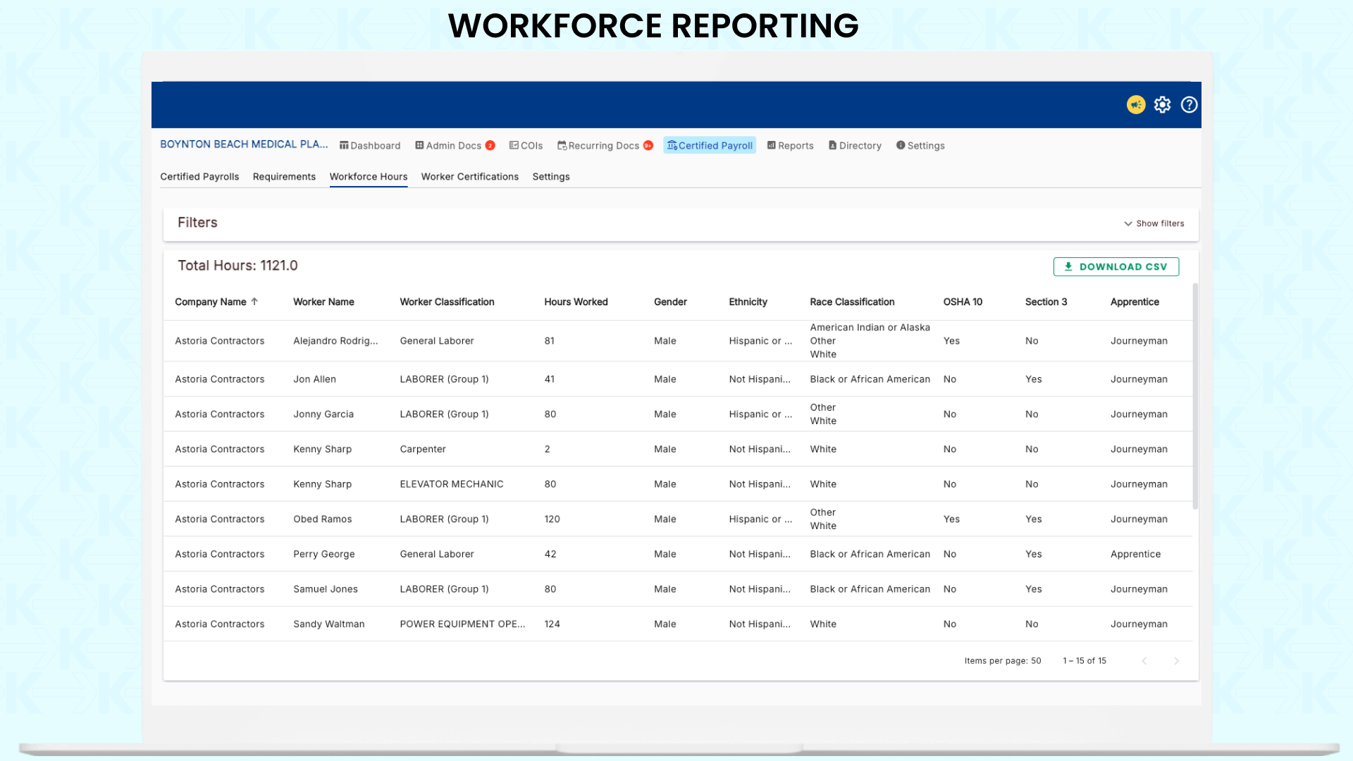 ✅ Workforce Reporting – Track worker demographics, apprenticeships, Section 3, certifications, and local hire goals in real time