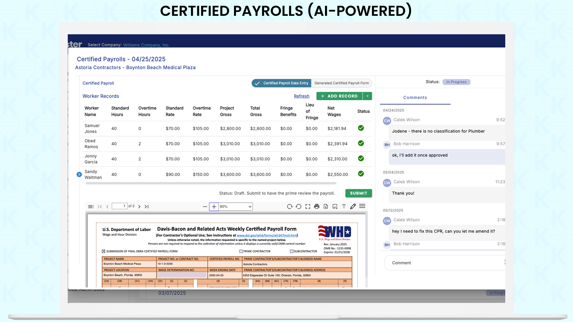 ✅ AI-Driven Subcontractor Certified Payrolls – Collect and generate weekly subcontractor certified payrolls in one place while automating validation of wage rates, fringes, and worker classifications for full compliance