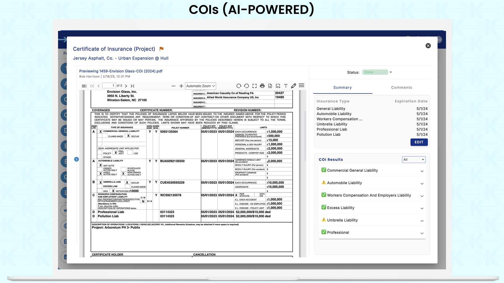 ✔ AI-assisted COI review with seamless integrations