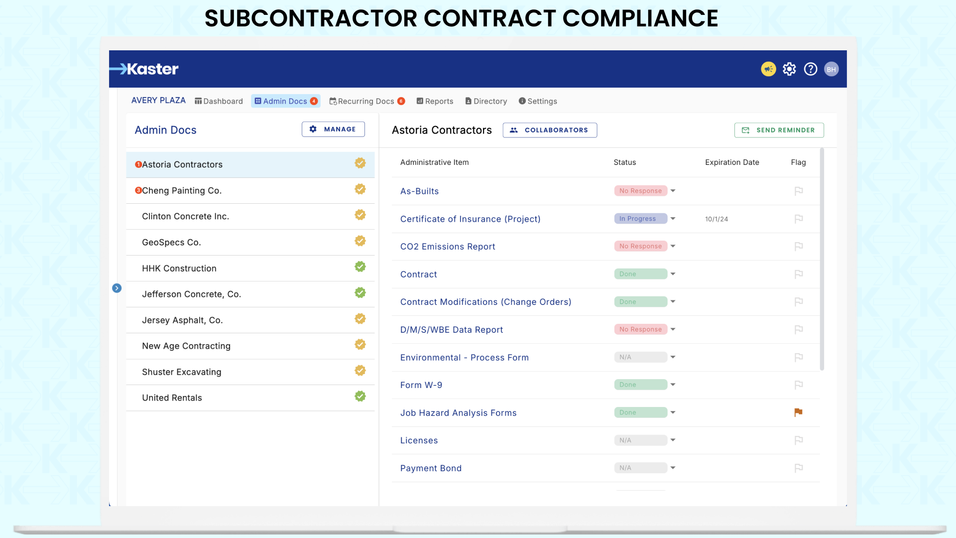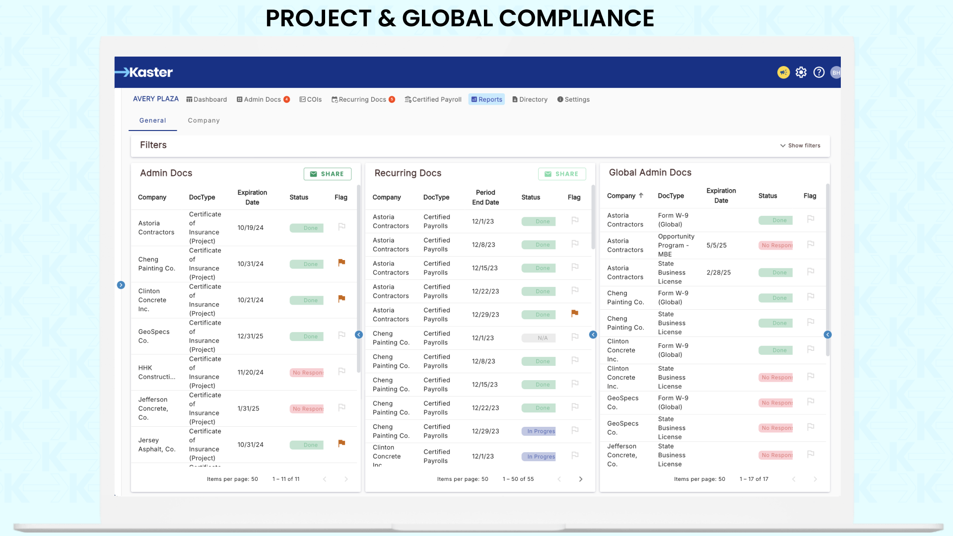 Kaster is a cloud-based subscription platform. With subcontractor certified payrolls and workforce reporting at the core — plus COIs and compliance documentation — teams gain unmatched visibility, control, and peace of mind.